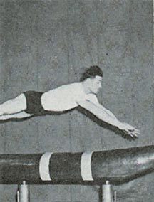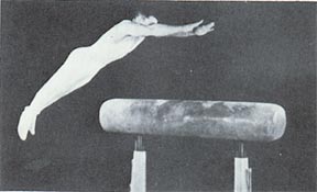 This athlete is vaulting on the "neckless" horse of the 1950's.