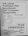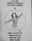 In 1973-74, the WIAA State Meet was officially started. It was held at Bellevue Community College under directorship of Sue Whitney. There were 58 schools represented with 286 competitors. Compulsories and optionals were held.