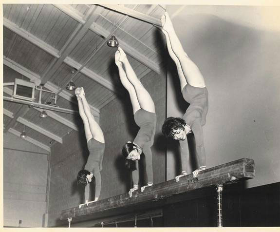 Membership was rounded up with more publicity in the Daily and from announcements at basketball games and eventually the activity took shape. The group, chiefly the men, did demonstrations for The March of Dimes, several fraternities and most successfully at several half time basketball games. “Tumbling Act Rocks Pavilion; Nuts to Basketball say Fans,” read The Daily (50) after the exhibition group astounded the audience and upstaged the basketball game itself. It was at this particular half time event that a woman was included for the first time.